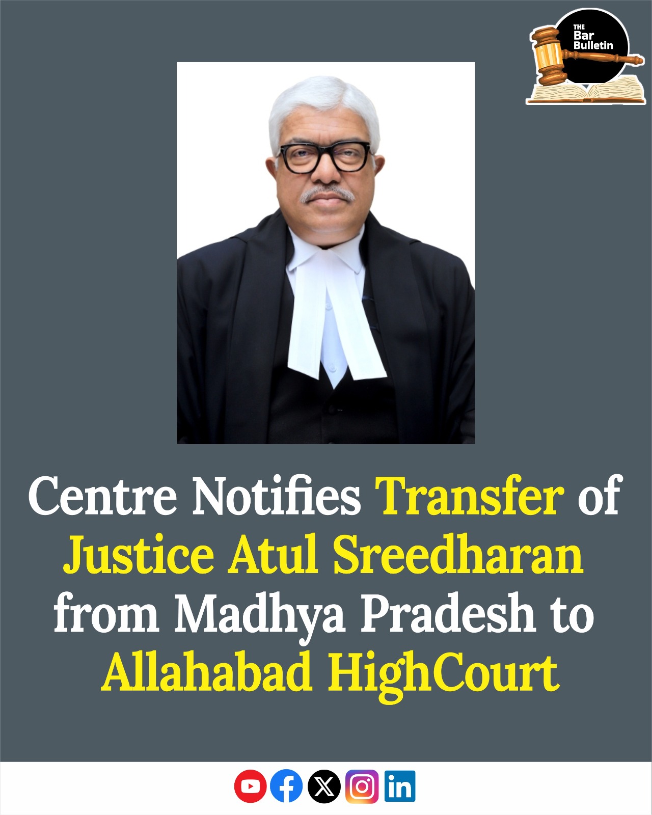 Centre Notifies Transfer of Justice Atul Sreedharan from Madhya Pradesh to Allahabad High Court October 21, 2025 Read More »