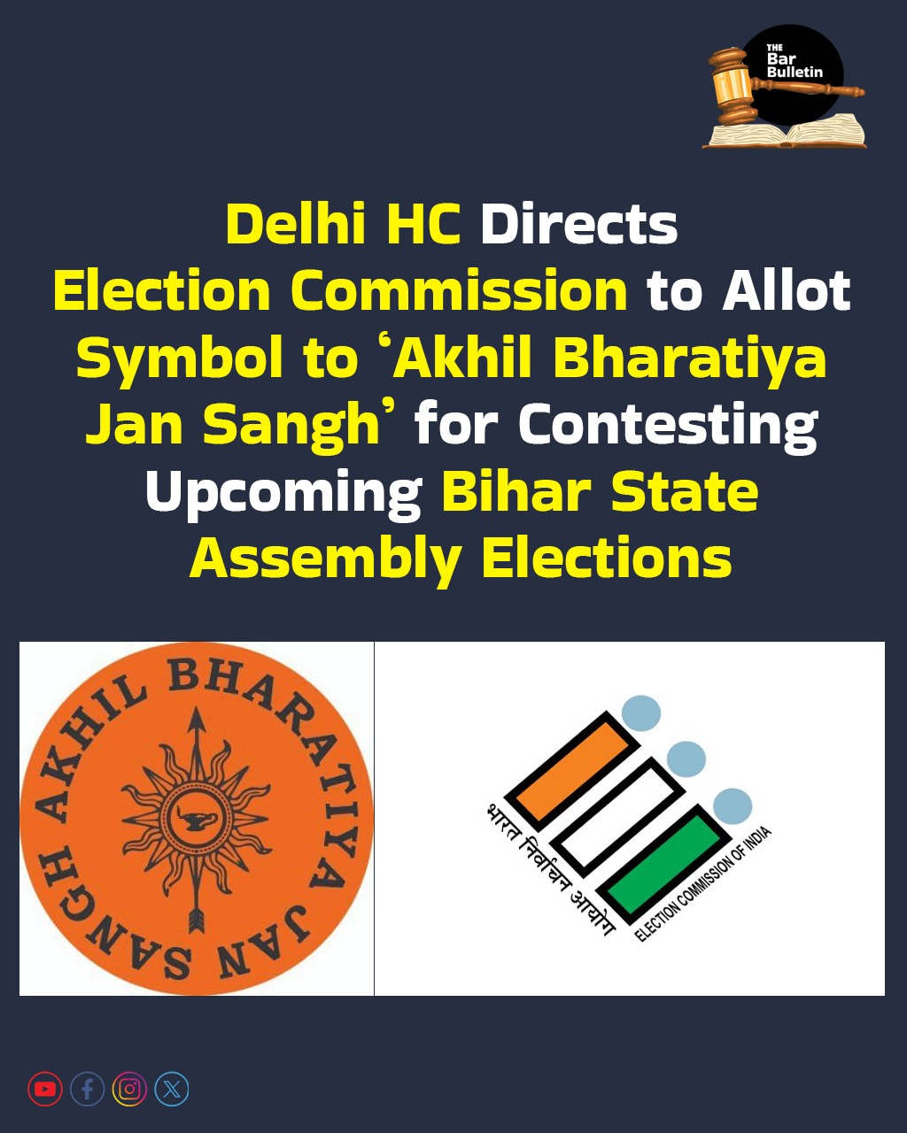 In a writ petition filed before the Delhi High Court to seek directions against the Election Commission of India (ECI), a Single Judge Bench of Justice Mini Pushkarna found Akhil Bharatiya Jan Sangh entitled to relief as prayed and directed ECI to allot a common symbol to the petitioner party for contesting the upcoming State Assembly Elections in Bihar once they have submitted a required declaration.
