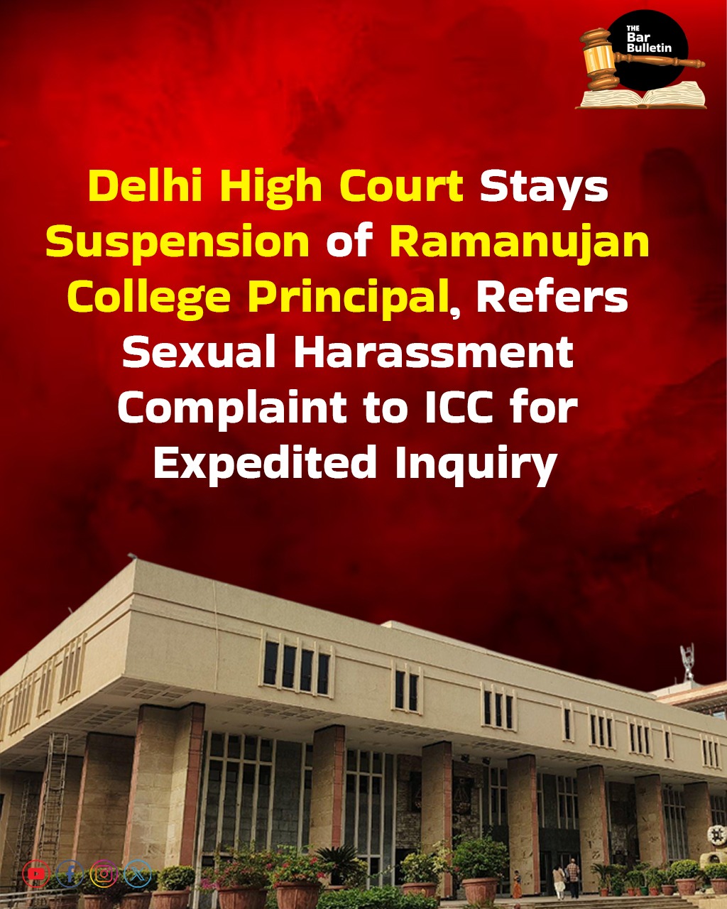 The Delhi High Court has stayed the suspension of Principal of Ramanujan College, University of Delhi, who had been suspended by the College’s Governing Body on 18 September 2025 following complaints of alleged harassment made by three Assistant Professors.