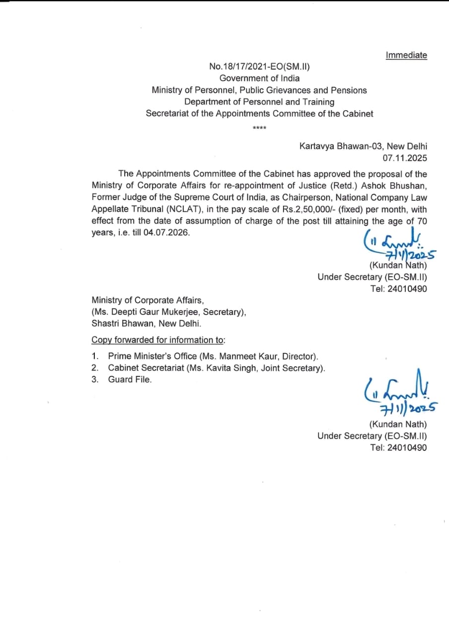 The Appointments Committee of the Cabinet (ACC) has approved the proposal of the Ministry of Corporate Affairs for the re-appointment of Justice (Retd.) Ashok Bhushan, former Judge of the Supreme Court of India, as Chairperson of the National Company Law Appellate Tribunal (NCLAT).