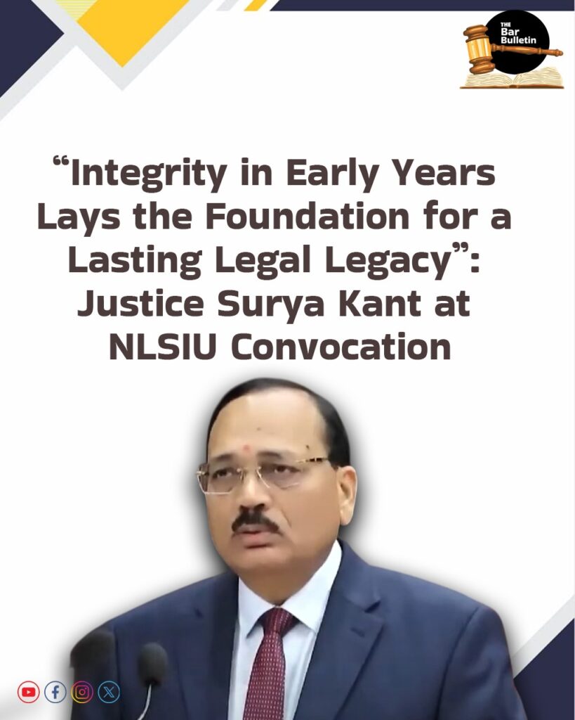 The 33rd Annual Convocation of the National Law School of India University (NLSIU), Bengaluru, witnessed a powerful and reflective address by Justice Surya Kant, Judge of the Supreme Court of India, who urged the graduating class of 2025 to anchor their professional journeys in integrity, authenticity, and service to society.