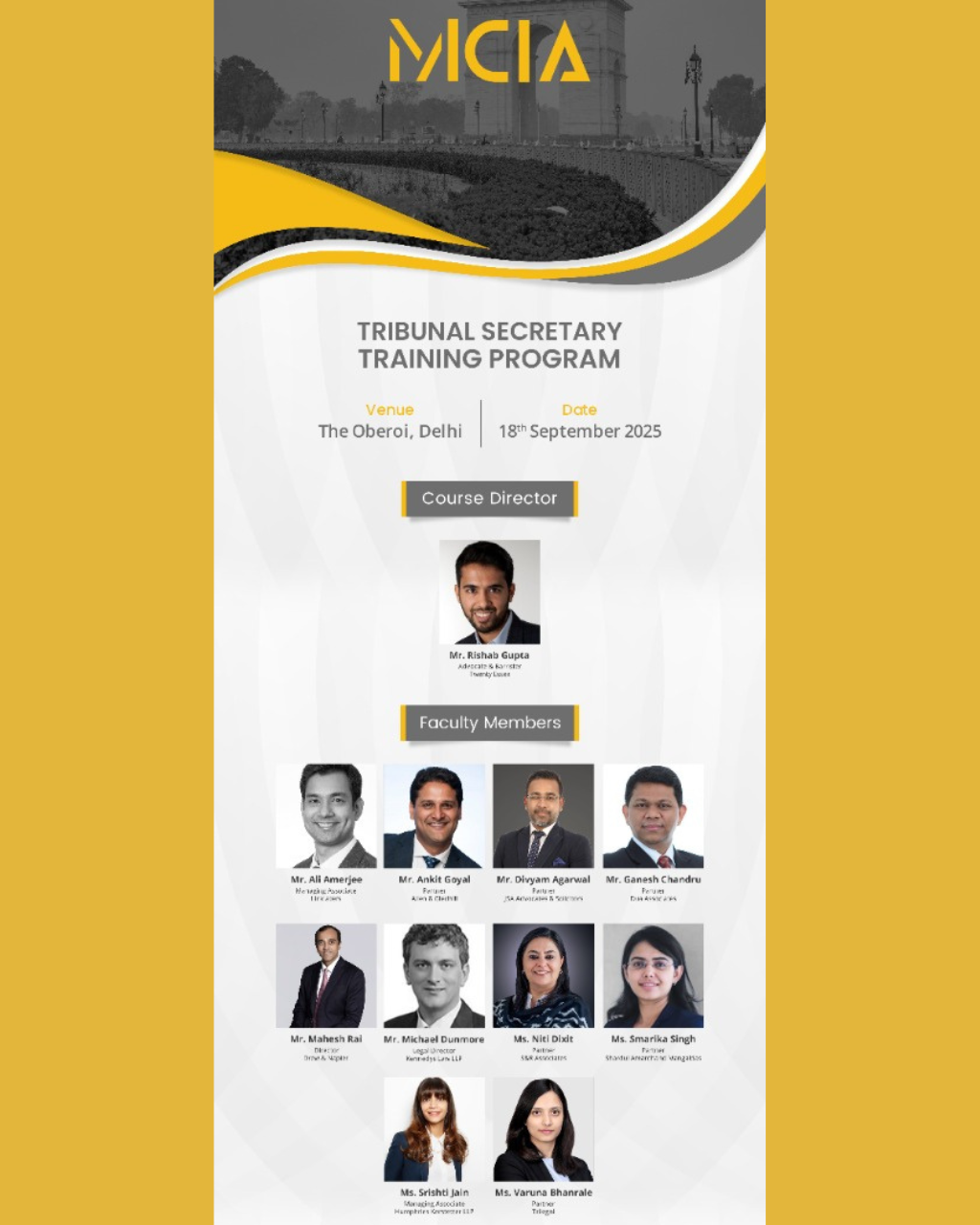 The Mumbai Centre for International Arbitration (MCIA) is organizing a Tribunal Secretary Training Program on 18th September 2025 at The Oberoi, Delhi.